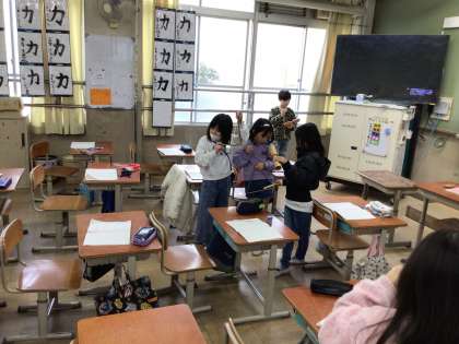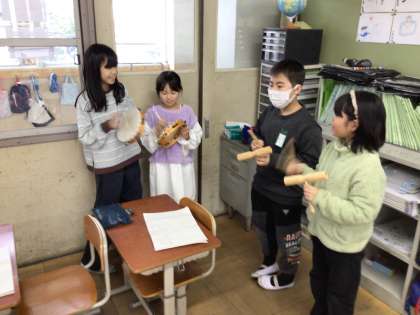 タンバリン、トライアングル、ウッドブロック、小太鼓をたたいて自由に音を鳴らしています。