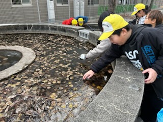 校内のビオトープの水が凍り、氷ができていました。