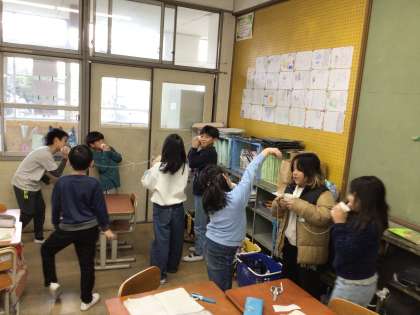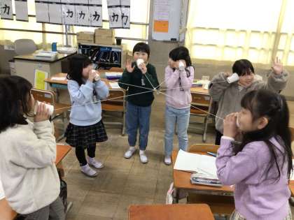 糸電話を使って、音がつたわる様子を調べています。