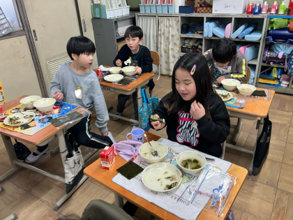 海苔の上に、上手にご飯と具をのせて食べていました。