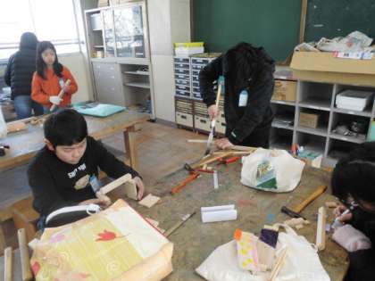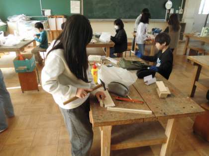 のこぎりで木材を切り、釘打ちをしました。