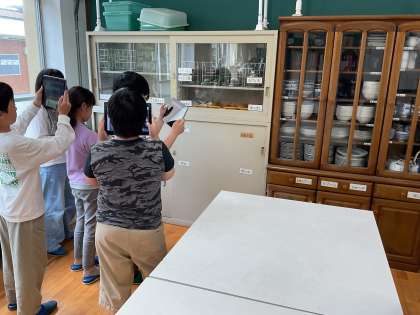 家庭科の学習で家庭科室に何があるかを調べに行きました。