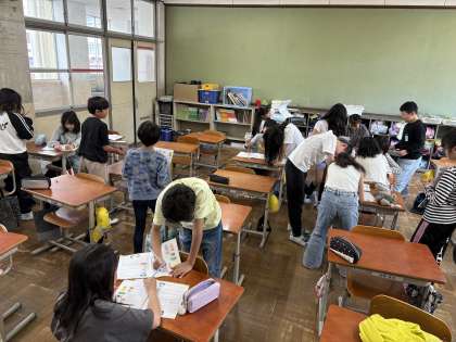 世界のいろいろなあいさつをして、お互いに好きなものを英語で伝え合いました。