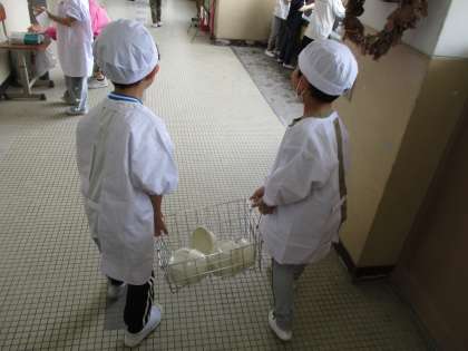 エプロンを着て、給食当番のお仕事をがんばっています。