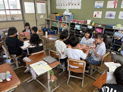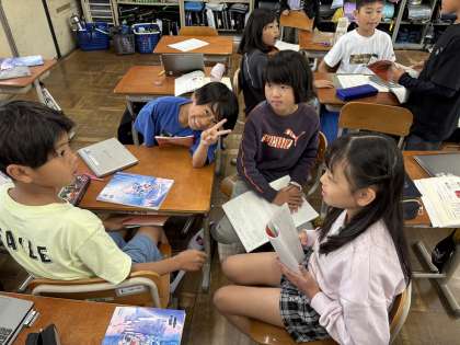 いろいろな先生の子どものときに夢中になっていたことに関する話を聞いて、メモを取っています。