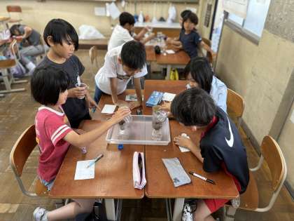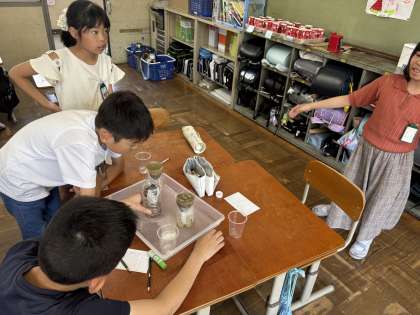 土の種類によって水のしみこみ方に違いがあるかどうかを調べる実験中です。
