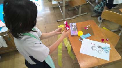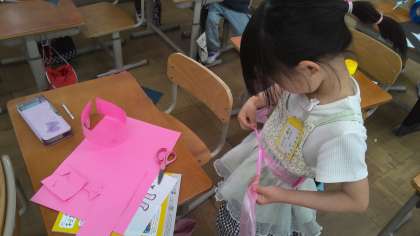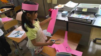 図画工作科の学習で、わっかを使って自分が変身したいものになる準備をしました。