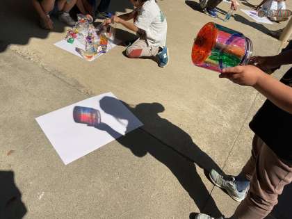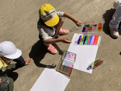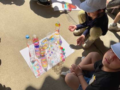 図画工作科の学習で、透明の容器に色をつけて太陽の光に当てました。