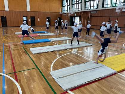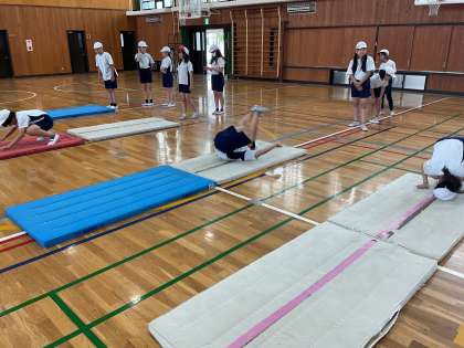 体育の学習でマット運動をしています。