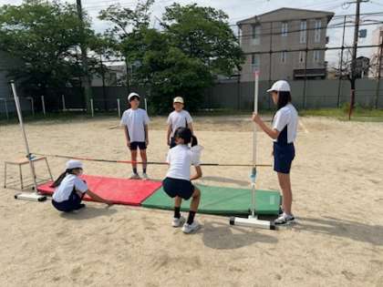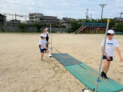 今日は、3歩や5歩で踏み切るタイミングと振り上げ足を高く上げる練習をしました。