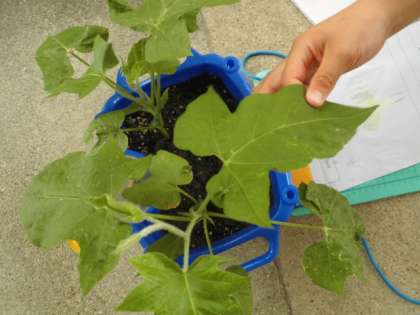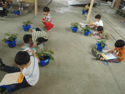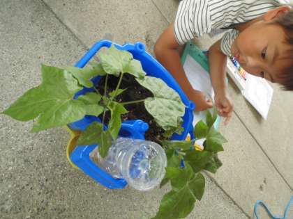 葉っぱが増えてきたあさがおを見たり、触ったりしながら