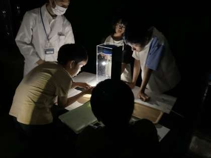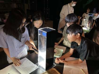 実験器具を使って雲づくりに挑戦しました。部屋を暗くすると、なんと雲が作れていました!