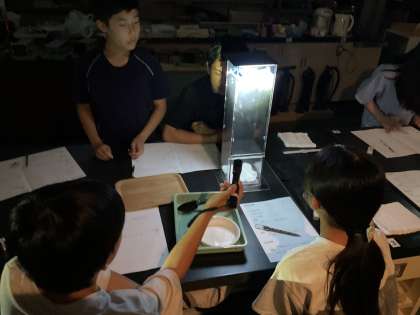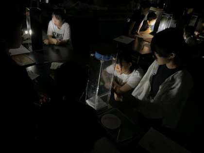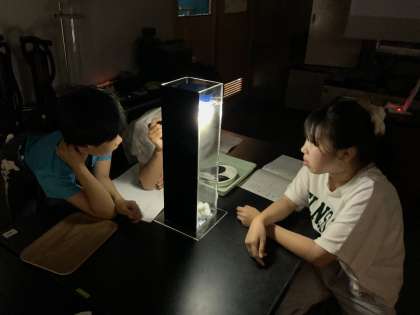 実験器具を使って雲づくりに挑戦しました。部屋を暗くすると、なんと雲が作れていました!