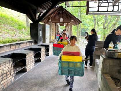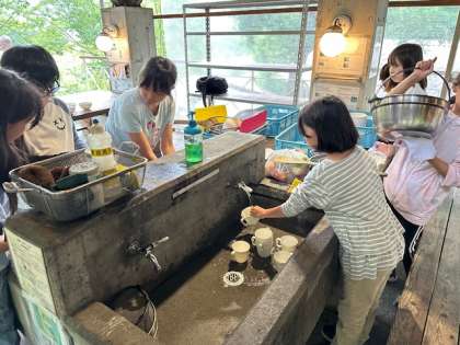 野外炊事です。それぞれ自分の仕事をがんばります!