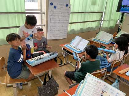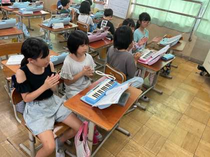鍵盤ハーモニカと手拍子を合わせて演奏しています。