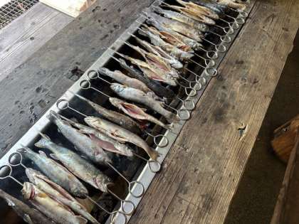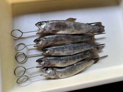串を刺して焼きます。おいしそうです。