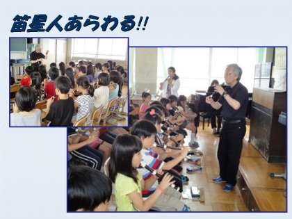 子どもたちは,北村先生とは初対面ですが,さすが笛星人。子どもたちは笛星人の魔法にかかったようにリコーダーを必死に吹いていました。ピッと背筋が伸びた姿勢,北村先生を見つめる眼差し。子どもたちの真剣に取り組む様子がうかがえます。次回は10月です。次回が楽しみです。