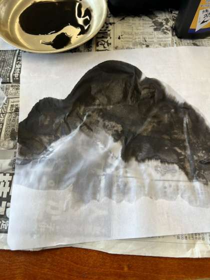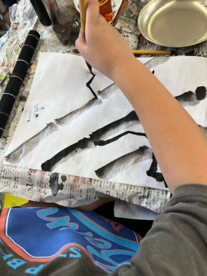 授業の締めくくりには、墨と水でできる模様を生かして、山を表現したり、花や竹を描くことにも挑戦しました。