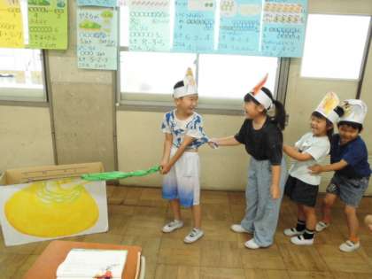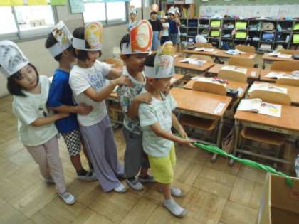 国語科「おおきなかぶ」で登場人物の気持ちを考えながらお面をかぶり、なりきって音読を楽しんでいます。