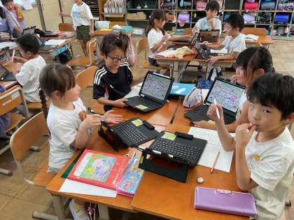 新しいGIGA端末とタッチペンを使って、案内までの道筋を考えたり、友達にアドバイスしたりするなど頑張っていました。