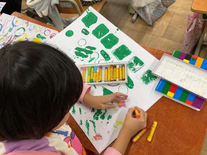 その後、クレパスで絵を描いて「自分だけの〇〇の世界」を作り出しました。