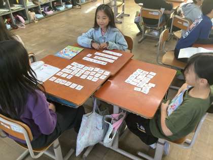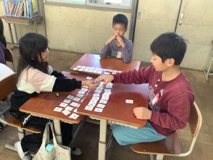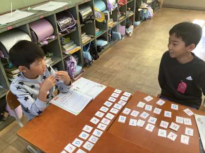 アルファベットカードを友達から借りて、自分の名前を完成させる活動をしました。