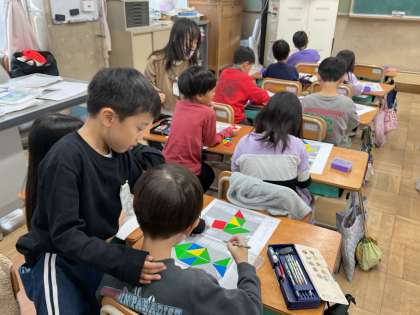 算数科では、三角形の色板を並べて、いろいろな形を作る学習をしました。