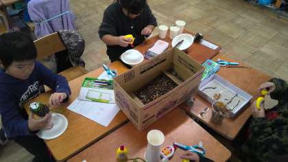 公園でひろってきたどんぐりや葉っぱ、木の枝であきのおもちゃを製作中。