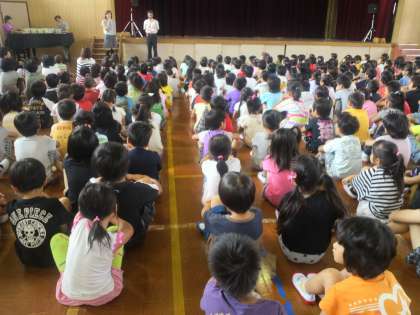 月曜日の1時間目に朝会がありました。1時間椅子のないところで姿勢を保って話を聞くことは,1年生にとって大変かもしれません。しかし,子どもたちは少しずつ成長し,後ろから見ていても背筋がピンと伸びて,話す人を見て聞くことができる子も増えてきました。