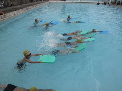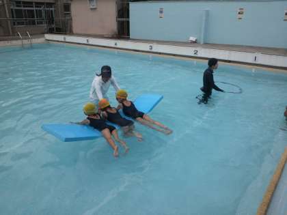 今日は,らっこチームといるかチームに分かれて練習しました。らっこチームは,顔を付ける練習をしました。いるかチームは,ビート板を使ってバタ足の練習をしました。