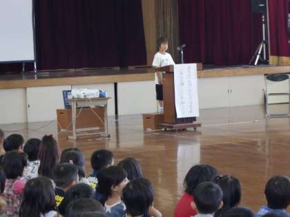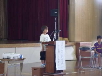 生活の学習で行った下鳥羽の「まちたんけん」をテーマにスピーチをしました。まちたんけんで子どもたちは下鳥羽のすてきなところをたくさん見つけて,さらに下鳥羽のまちが好きになったというスピーチでした。