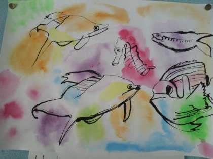 彩り鮮やかな画用紙に、描いたのは海の生き物たちです。割りばしに墨をつけて描きました。色んな表情の生き物たちが、海の中を泳ぐ姿が涼しげに描けました。