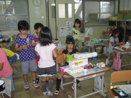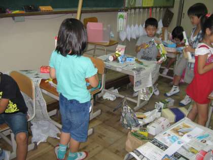 初めて接着剤(ボンド)を使って作品を作りました。たくさんの箱を積み木のように重ねる子,形を見立てて銃を作る子,どんどん上に積み上げる子,色々な活動の様子が見られました。