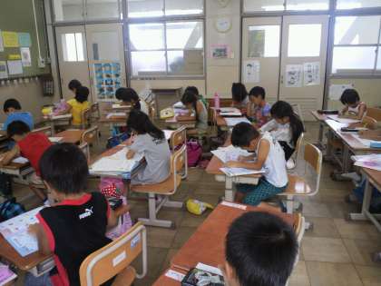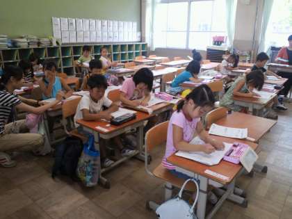 全体で半数以上の子どもたちが参加してくれました。約90分間子どもたちは宿題や課題プリント,やり直しなど取り組みました。夏休み中の学習は,これまでの学習の総復習ができるいい機会です。苦手な「は・を・へ」やひきざんに取り組んだり,ひらがなのやり直しをしたりとそれぞれの子どもが自分の課題に真剣に取り組むことができました。