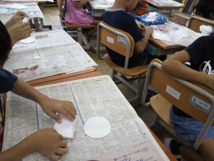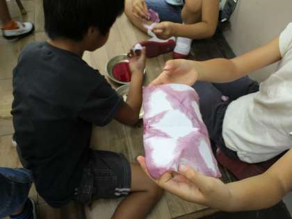子どもたちは折り方や染める場所を工夫し,様々な模様ができました。乾いてから,ラミネートをし持ち帰ります。