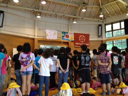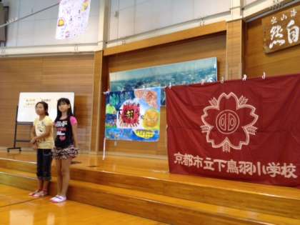お弁当を食べおわり、入所式が始まりました。リーダーが司会をつとめて、校歌で旗あげをしました。