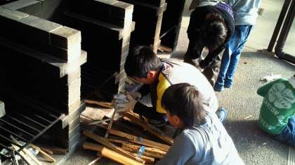 食材を切る間に、かまどに薪を入れて火を起こす準備をしています。