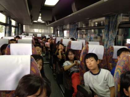 13時30分に水族館を出発し、小雨の降る中、京都に向けてバスは走っています。車内の子どもたちは、「名探偵コナン」DVD鑑賞か、熟睡中(( _ _ ))..zzzZZです。