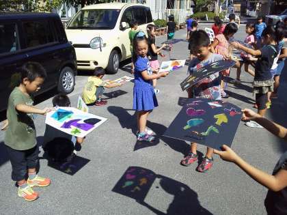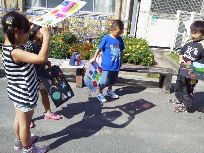光があたるとセロハンが地面にうつってとってもきれいです。
