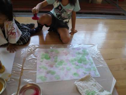 今回は,絵の背景を絵具でぬりました。絵具をにじませたり,ポンポンスタンプで色をつけたりしました。 来週は,画用紙に絵を描いていきます。