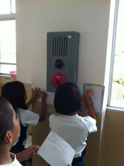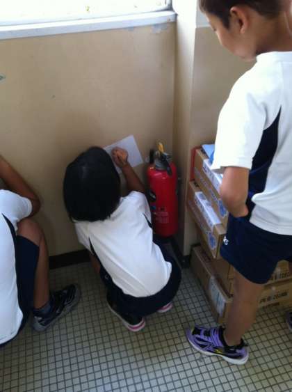 今日は,下鳥羽小学校では火事をふせぐためにどのような設備があるのかをグループ毎に調べました。消火器,消火バケツ,火災報知機・・・様々な設備があることに気がつきました。