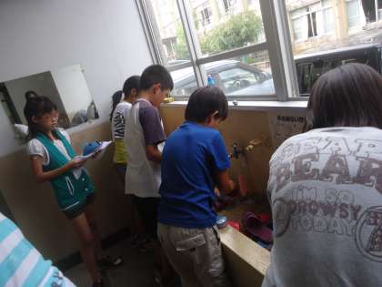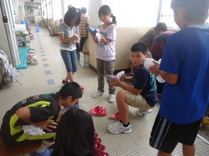 今日の委員会で,環境美化委員会と保健委員会の子どもたちが,学校のトイレのスリッパをきれいに洗いました。