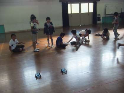 ゴムの伸ばし方で車の進む距離をコントロールできるのか検証しました。少しずつゴムの伸ばす長さを調節し,指定された距離まで車を進めていました。