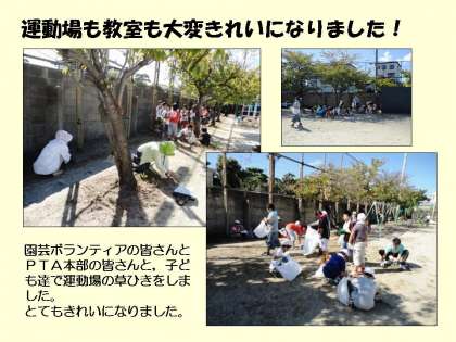今日は,草ひきと大掃除を行いました。5名の園芸ボランティアの皆様と19名の保護者の皆様のご協力を得て,子どもたちと一緒に運動場やふれあい広場の草ひきや教室の大掃除をしました。