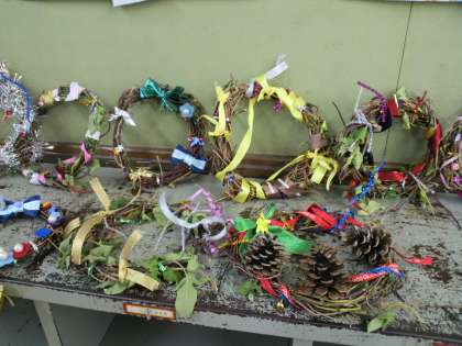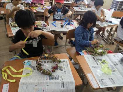 できた土台にもってきたリボンやモール,かざりなどをつけて,かわいらしい手作りリースができました。中間休みも使って夢中で作ってる子どももいました。