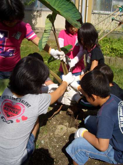 春に植えて育ててきたサトイモを,みんなで掘りました。