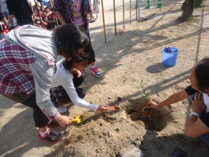 いただいた苗木を,今日,6年生みんなで,運動場の西門の近くに植えました。