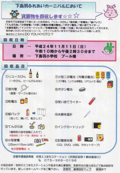 下鳥羽ふれあいカーニバル開催時に資源物の回収を致します。是非この機会にご家庭で不要となった使用済みの資源物(リュース・リサイクルできるもの)をご持参下さい。