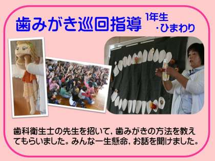 1年生とひまわり組を対象に,今年度2回目の歯科巡回指導が行われました。歯科衛生士さんに来校していただき,むし歯予防の指導をしていただきました。