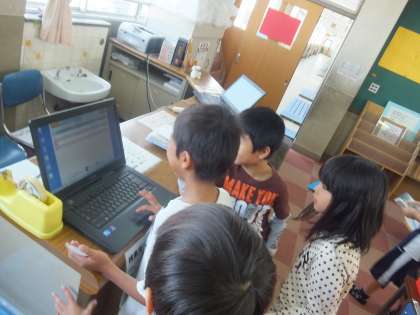図書室にある検索コーナーで,探している本が貸し出し中かどうかを調べている子もいました。